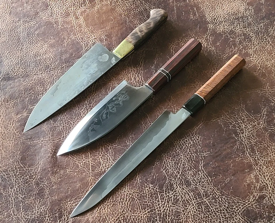 Edge upkeep: When a knife’s edge begins to roll over from use, simply strop the edge with a leather strop or ceramic honing rod. On kitchen knives I prefer a leather strop loaded with a bit of diamond paste or cbn compound. Another big thing to note on fine kitchen knives, the edge will last longer when used on a soft wood cutting board. Cutting boards to avoid when you can: plastic, bamboo, glass, or bare countertop. (If you are in a professional environment I know you have to use a NSF approved plastic board) just know that you need to maintain your edge more regularly.